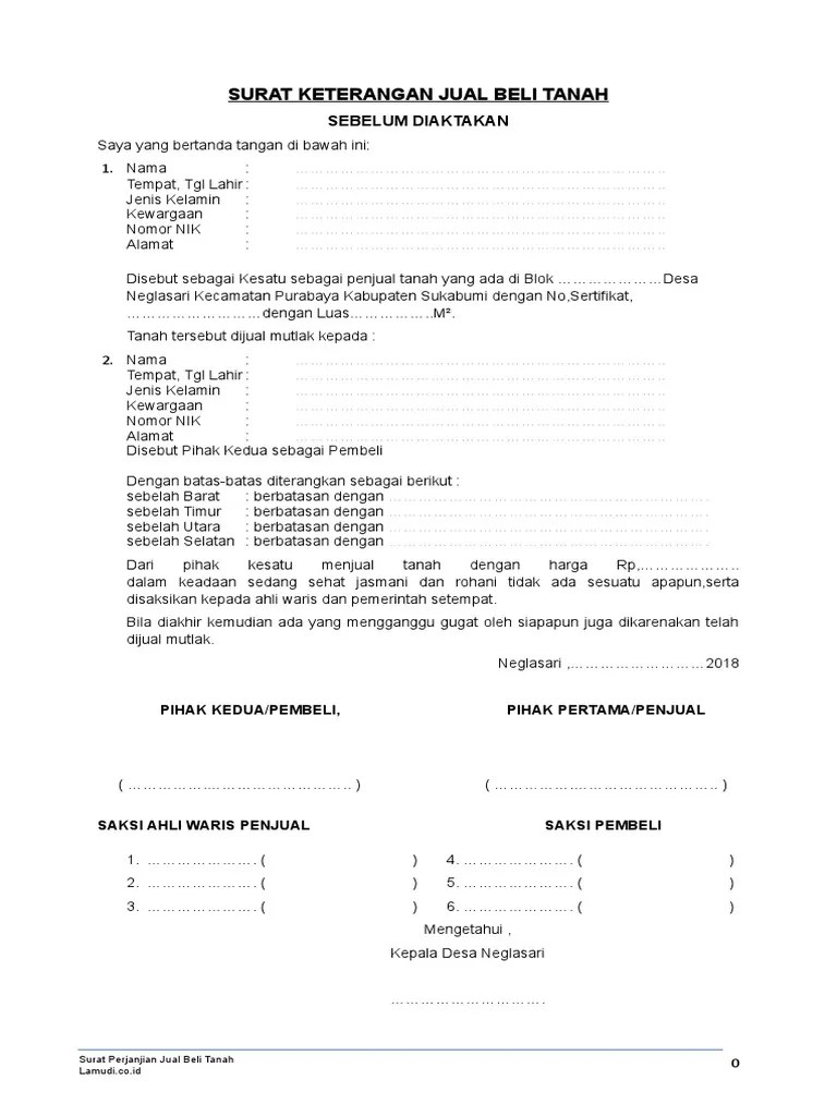 Pihak pertama memberikan jaminan penuh bahwa tanah berikut bangunan yang terletak di atasnya yang dijualnya adalah: Jual beli tanah tersebut di atas dilakukan dan diterima dengan harga [(rp. Surat perjanjian jual beli tanah adalah dokumen kesepakatan tertulis antara penjual dan . Pembayaran akan dilakukan secara tunai dan tidak melalui perantara . Kami yang bertanda tangan di bawah ini: